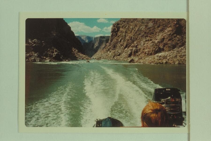Swanson in an outboard powered Zodiac craft climbing onto the tongue of 232 Mile Rapid at Mile 232.4 better known as Requiem Rapid