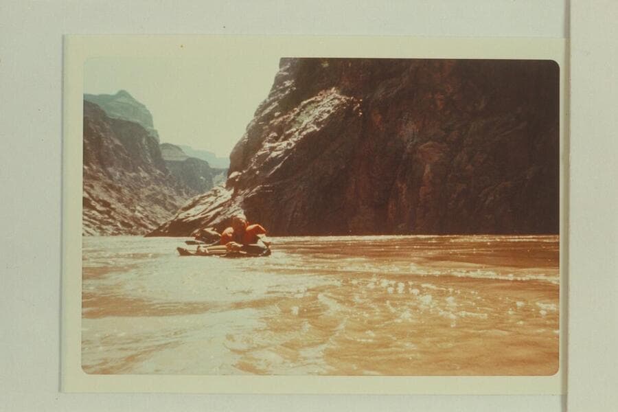 Bill Mooz inflates the small unit which was to convoy the air mattresses on Lake Mead to get them to Pierce Ferry. Looking upriver about Mile 234 1/2