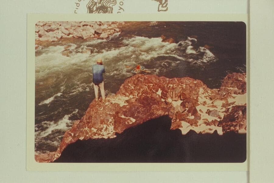 Bill Belknap on left bank of Gneiss Canyon Rapid, photographs test run of Sportyak