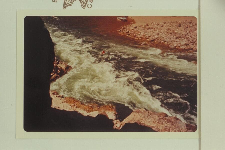 Bill Belknap on left bank at Gneiss Canyon Rapid, photographs test run of Sportyak