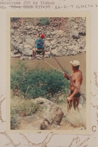 Upstream toward the cable at Bridge Canyon Dam Site. Visbak notes that Homer is in the cable car
