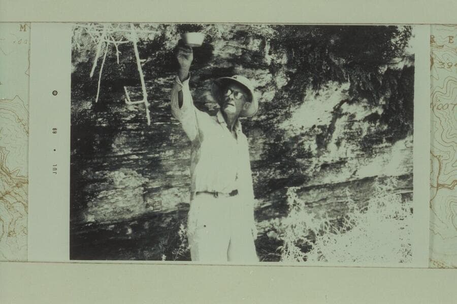 Louis West gathers a few drops of water from a spring in the right hand or main fork of Separation Canyon