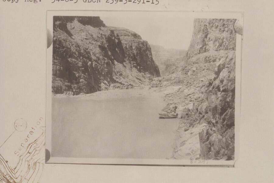 Downstream at the head of Separation Rapid- right bank. The three boats of the Dusty Dozen appear at lower right