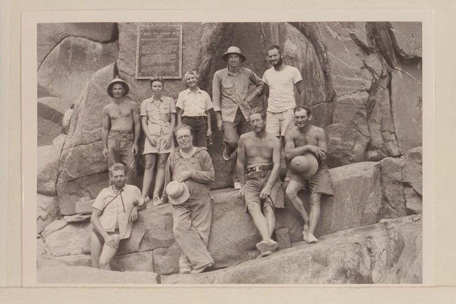 The 1940 Nevills party at the plaque at Separation Rapid. Lower: Hugh Cutler, Bona Deason, Charles Larabee, Del Reed. Upper: Norm Nevills, Doris Nevills, Millie Baker, John Southworth, Barry Goldwater