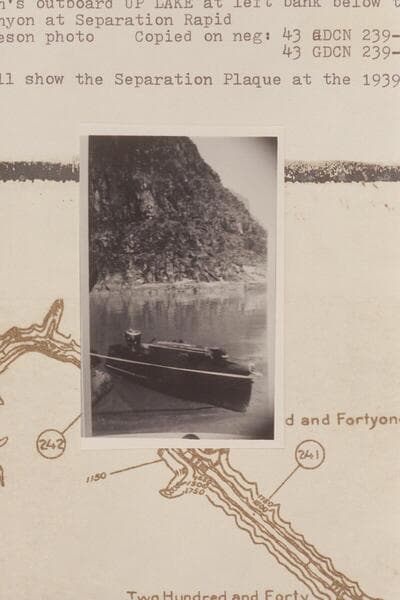 Harry Aleson's outboard "Up Lake" at left bank below the mouth the side canyon at Separation Rapid. A glass will show the Separation Plaque at the 1939 location