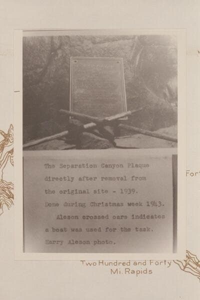 The second Separation Plaque on the beach below its first location after it had been removed by Aleson for the purpose of locating it at a higher elevation above top levels of Lake Mead. Christmas week, 1943