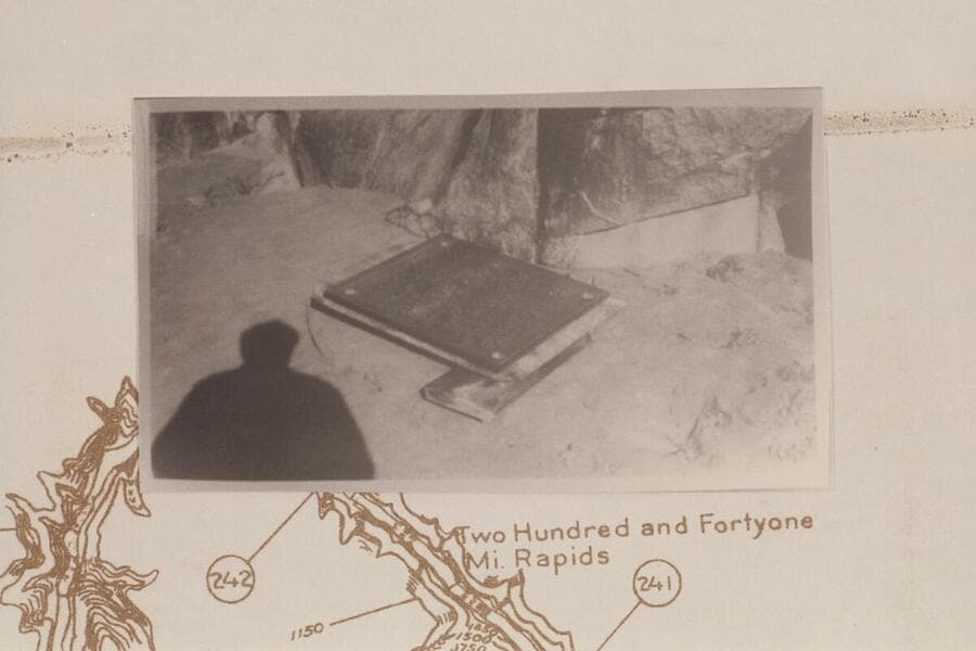The second Separation Plaque ready for installation at the higher location above the top level of Lake Mead. The plywood beneath the plaque was used as a template for drilling the holes in the preCambrian . Christmas week