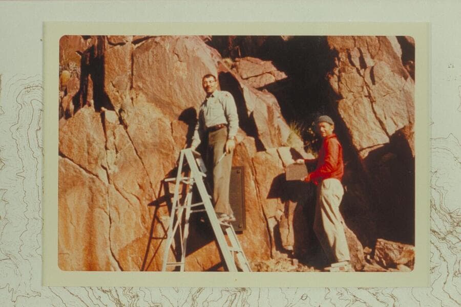 Jim Bailey and Frankie Strathairn fasten 1934 plaque at Separation Canyon