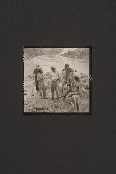 Rod Sanderson; Jack Couffer; John Riffey; Claude Nichols. On the beach upper end of mouth of side canyon at Mile 220