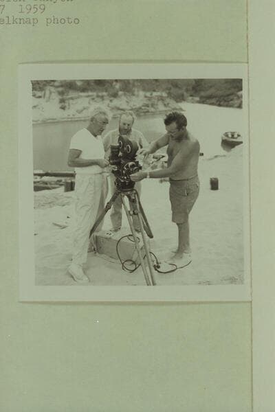 Rigging the camera. Paradise Canyon. Gordon Avil and Jim Algar on beach. Dick Kelley and Doc Reed on cliff