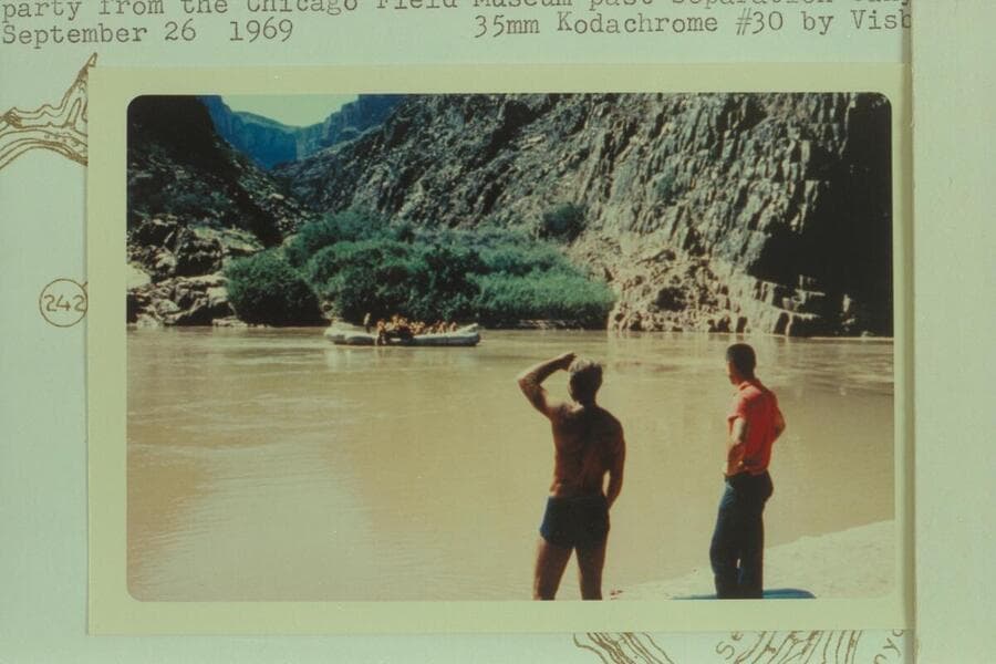 Crew of the float trip watch the baloney carrying the party from the Chicago Field Museum past Separation Canyon