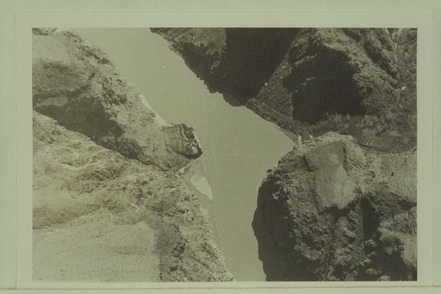 Mouth of Spencer Canyon. Lower center is the lava block which gave the name to the former rapid- Bold Escarpment Rapid and Lava Cliff Rapid