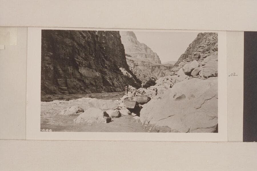 Mattowitteki Rapid. Downstream view of Lava Escarpment Rapids showing the boats "Glen" and "Marble", the last to be lined past this rapid