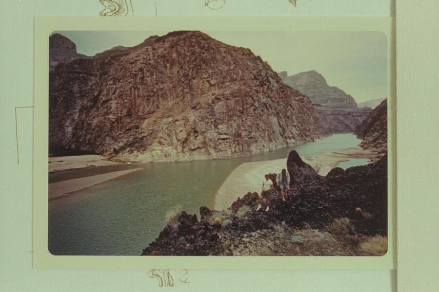Mouth of Spencer Creek at left and down upper Lake Mead from the top of the lava cap on the right bank