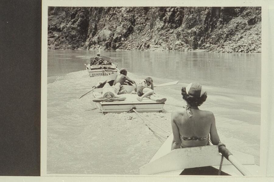 Three of the four Wright boats on Lake Mead after the Grand Canyon traverse. The boats are being towed by the "Lollipop" with Jim Rigg as pilot