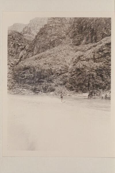 William Gerritt Cooper skiing on the upper end of Lake Mead after traverse of Marble and Grand Canyon with motor boats