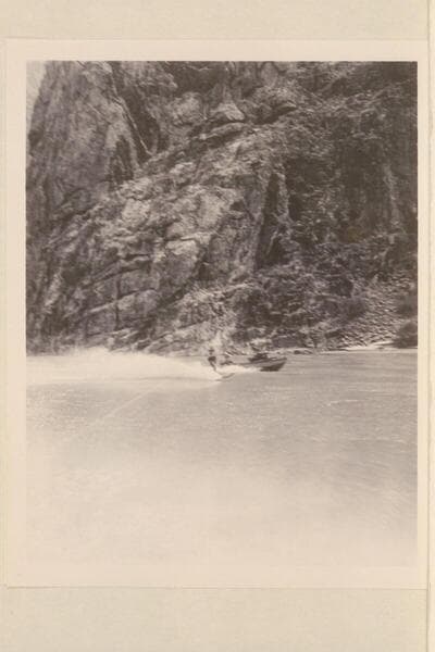 Cooper skiing on upper Lake Mead in Grand Canyon. The "June Bug" is in the distance