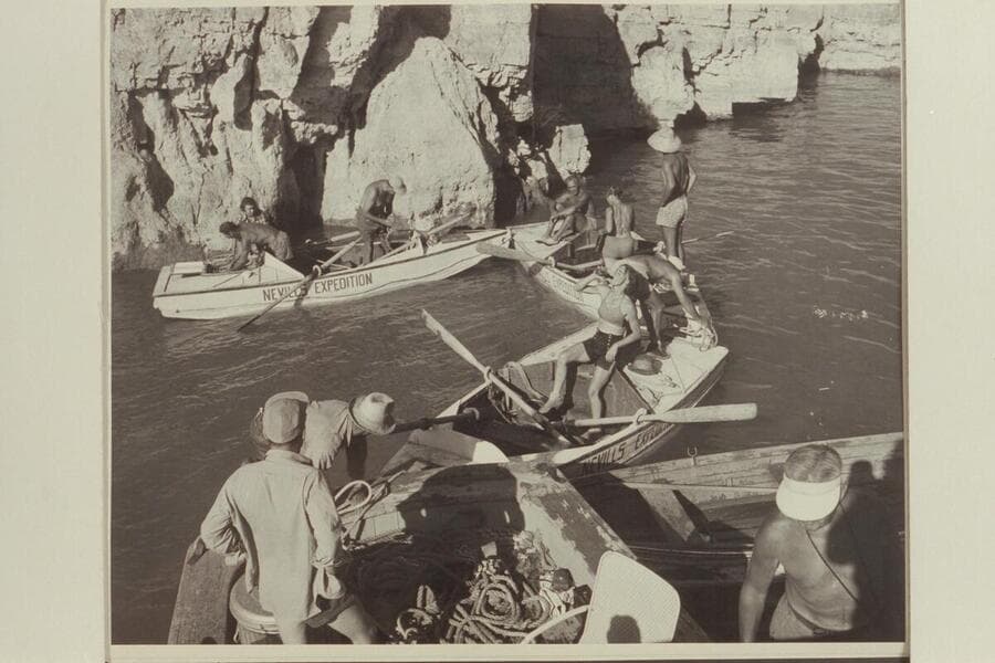 The boats of the 1948 Nevills party pull alongside the power boat which met them at the head of Lake Mead