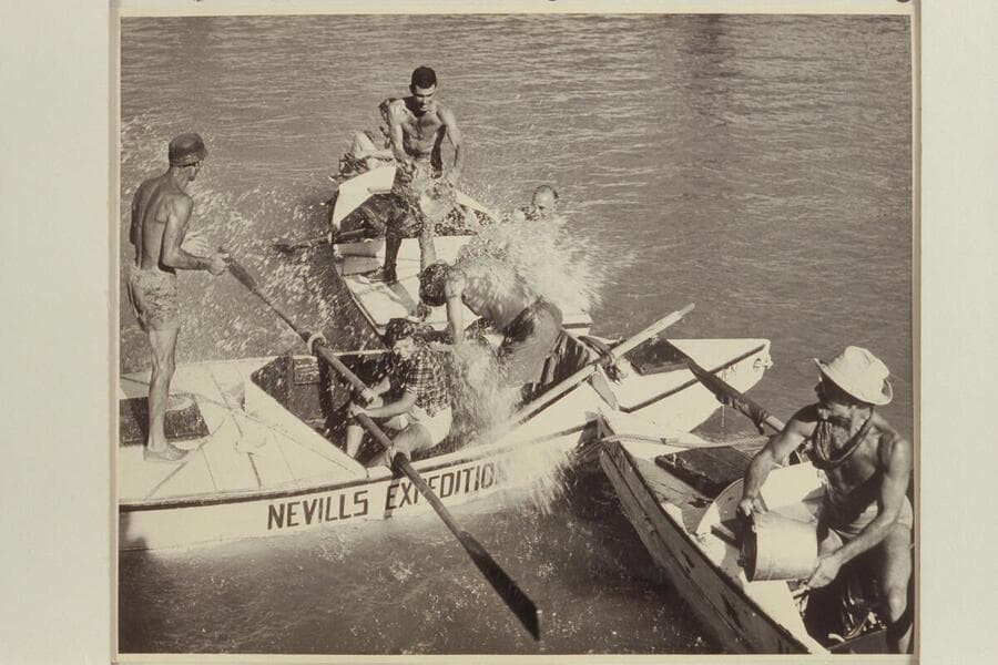 Water fight; Lake Mead;left to r: Nevills;Lucile Hiser hidden back of Garth Marston who is throwing bucket of water;Nancy Streator at the oars of the "Wen,"John Doerr getting the ducking;Moulty Fulmer almost hidden by the spray;Marston at extreme right