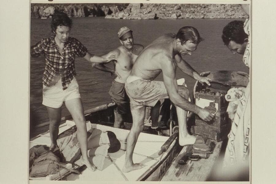 Nevills unloads the radio set which was recovered from the plateau below Point Sublime. John Doerr and Nancy Streator are back of him. The set was dropped to the 3 aviation men in 1944 when they parachuted into the Canyon