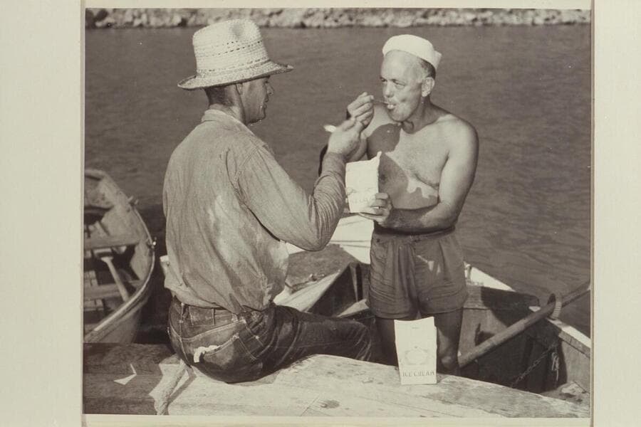 Frank Wright and Moulty Fulmer get into some ice cream at the end of the 1948 traverse of the Grand Canyon