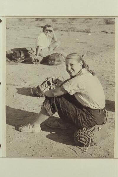 Zoe Desloge at Pierces Ferry, end of 1947 Grand Canyon traverse. Marie Saalfrank sits in the background