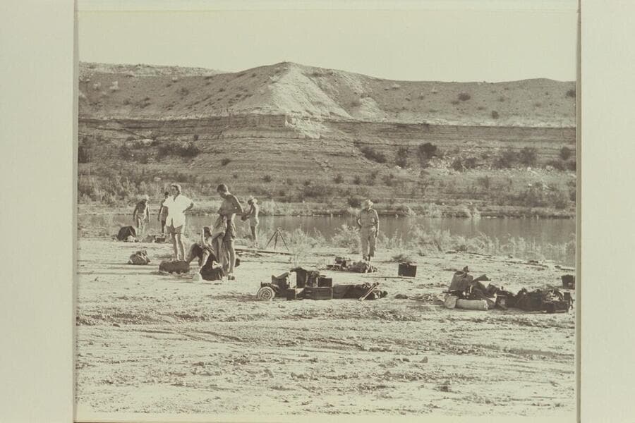 Packing up at Pierces Ferry camp before running in to Boulder City. End of Grand Canyon traverse of 1947. Left to right: Al Milotte; Garth Marston; Marie Saalfrank; Zoe Desloge; Joe Desloge; Otis Marston; Randall Henderson