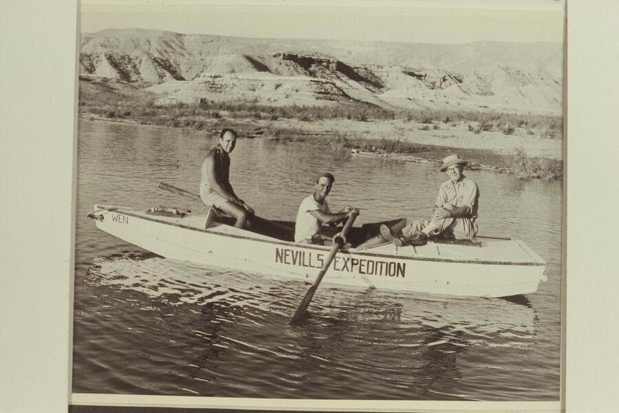 Al Milotte, Norm Nevills and Randall Henderson at Pierces Ferry at end of 1947 traverse of the Grand Canyon