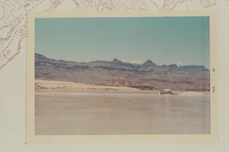 Motorboats at Lees Ferry. Higgins boat of Bureau of Reclamation at left. Art Greene's air prop boat at center