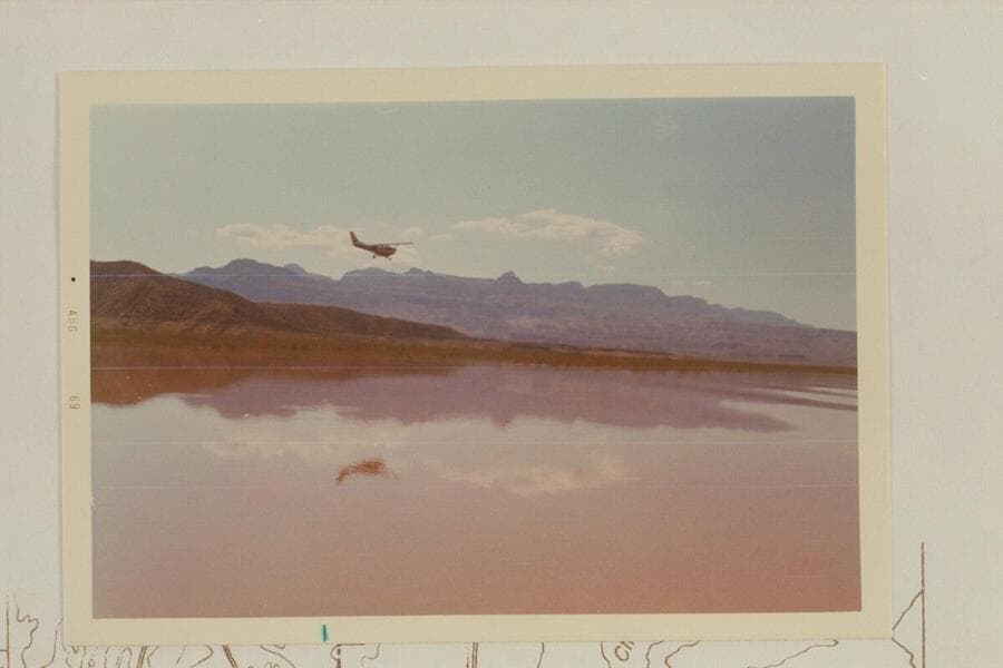 Chuck Rowland flying in above Gods Pocket on Lake Mead to check progress of deck boat