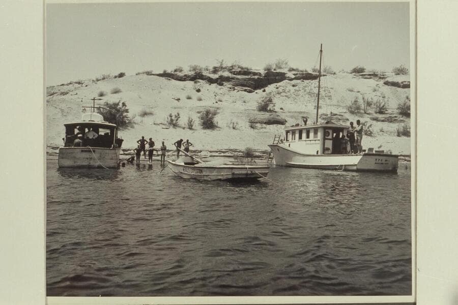 The Park boat and the "Hae Dae" stopped at Sandy Point on Lake Mead during lunch after end of Nevills party run of the Grand Canyon in 1948