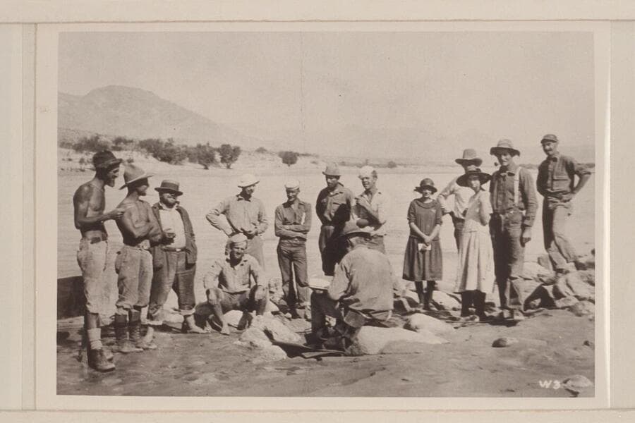USGS 1923 survey party with the Smiths at Griggs [sic] Ferry. Left to right: LaRue; Moore; Koms; Dodge (sitting); Stabler; Blake; Burchard; Birdseye; Lint; and Smiths. E. C. Kolb at extreme right end
