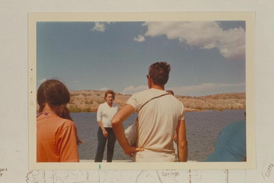 Helen Rowland greets the deck boat party at the dock at Temple Bar Wash
