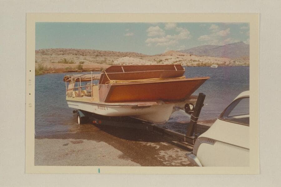 The deck boat on the trailer at Temple Bar Wash