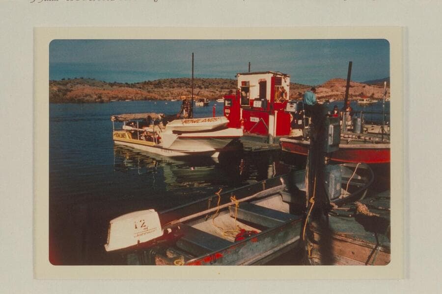 Helen Rowland greets the deck boat party at the dock at Temple Bar Wash