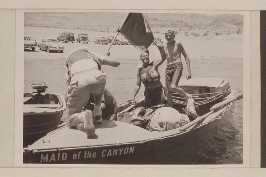 The "Maid of the Canyon" arrives at Boulder City. Roy Bolton waves as Jeff Marston steps forward. The Marine flag is being removed