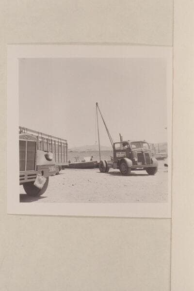 Jim Jordan's African Queen and the two Disney prop boats on arrival at Boulder City. Vee Bodrero and Les Gear work in the "Emma Dean"