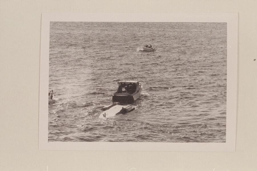 The "Gale V" being towed off the course after flipping on Lake Mead in the Gold Cup Races