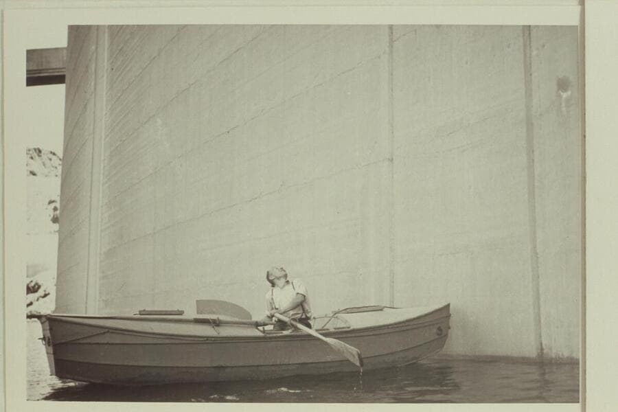Buzz Holmstrom posing in his skiff the "Julius F", just above Hoover Dam