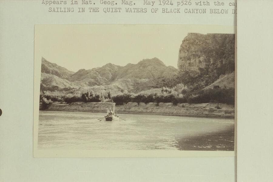 "Queen of the Canyon" on horseback. The skiff used by the USGS in the topographic survey of Grand Canyon National Park