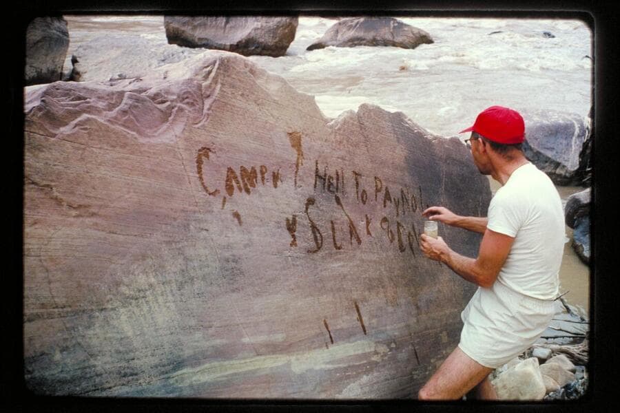 Jorgen Visbak checks the Best expedition and the G. M. Wright inscriptions at Rapid 16