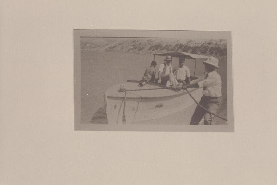 Motorboat towing the "Tapeats" and the canoe at Middle Black Canyon Damsite. Probably a LaRue photo during the cruise from Pierce Ferry to Needles