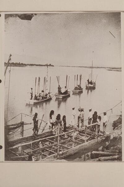 The start from Camp Mojave, Arizona. Boat expedition under Lieut. Wheeler, the first and only one to ascend the Colorado River through the Grand Canyon to the mouth of Diamond Creek. Note ferry in foreground which appears to have a rig for a sail