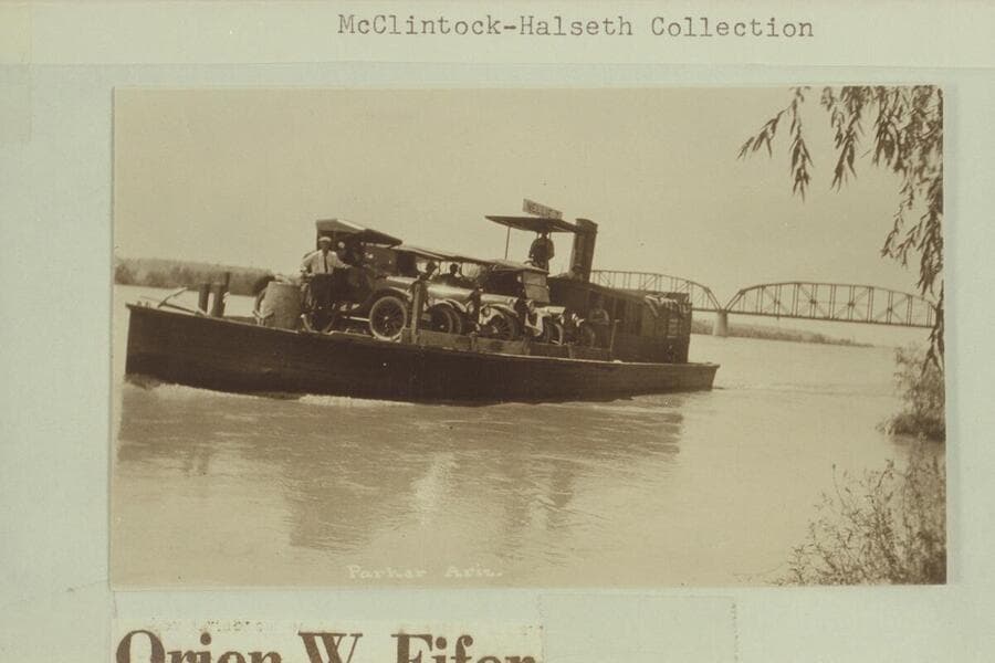 The ferry "Nellie T." in midstream of the Colorado River at Parker