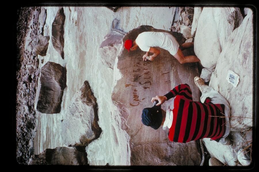 Dock Marston photographing the McDonald inscription at Best Wreck Rapid--Mile 204.55 right bank in Cataract Canyon