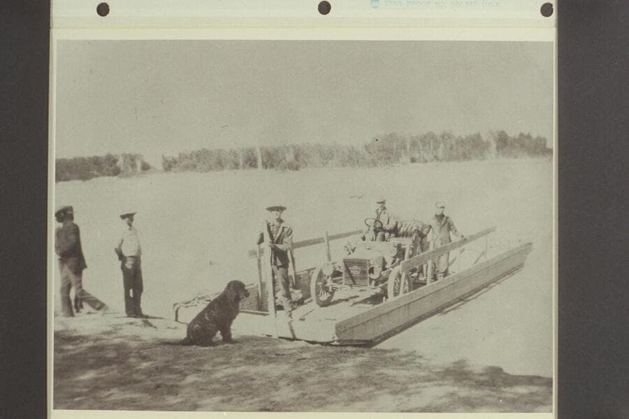 Skiff ferry carrying small buggy at Ehrenberg. The ferry is on its side at the right bank. Copied from print owned by Mrs. Fred V. Kuehn of Quartzite