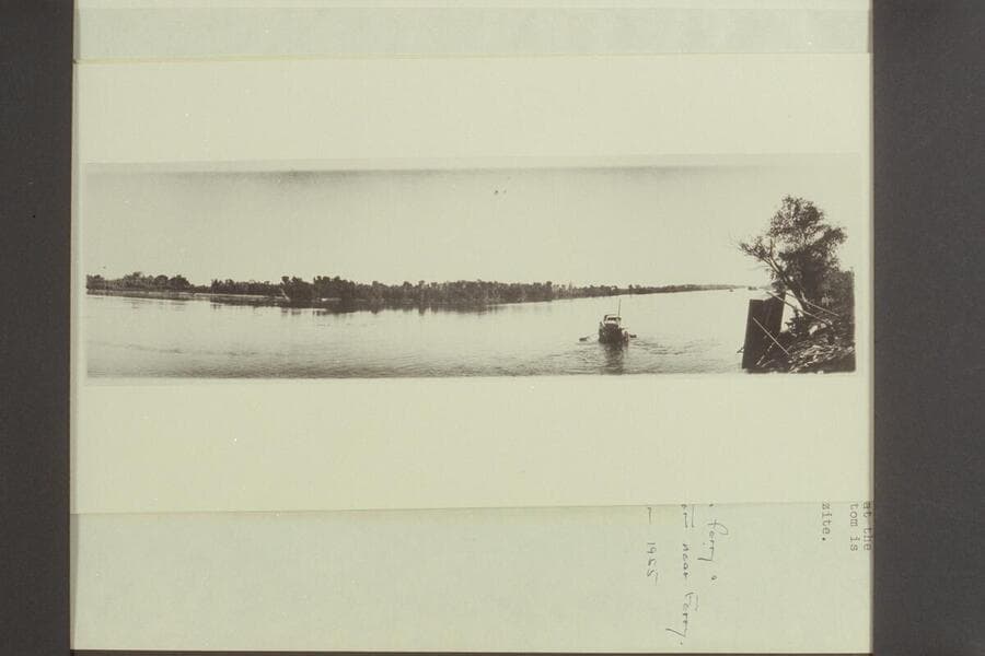 Skiff ferry carrying small buggy at Eherenberg [sic]. The makeshift oars are handled by an oarsman sitting under the buggy. The regular scow used for ferrying is on its side at the right of the photo where its water-logged bottoom is drying