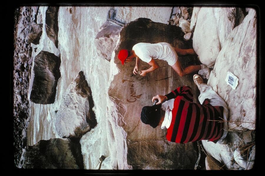 Dock photographs Jorgen Visbak who points up the Best Expedition inscription at Mile 204 1/2. Best Wreck Rapid