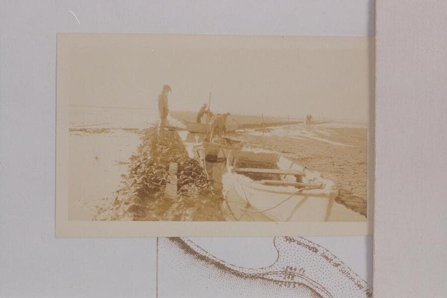 Pulling through the liquid mud of Salton Sea by rope. Neither oars nor poles will move a boat in this medium