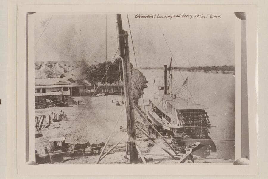 "Mohave" (I) (?) This photograph shows steamboat landing and ferry at Fort Yuma. Note the stage coach at lower left